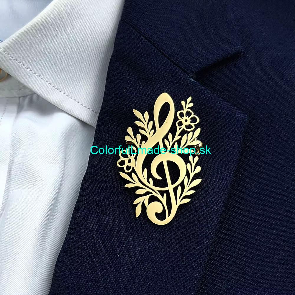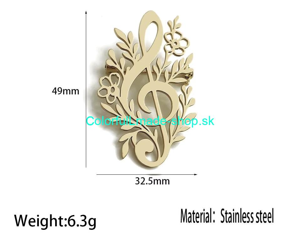 Ozdobná celokovová brošňa v tvare huslového kľúča. Zo zadnej strany má zatvárací špendlík s poistkou.