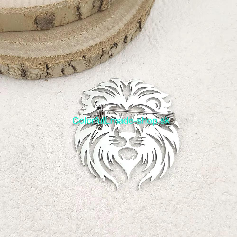 Ozdobná celokovová brošňa v tvare leva. Zo zadnej strany má zatvárací špendlík s poistkou.