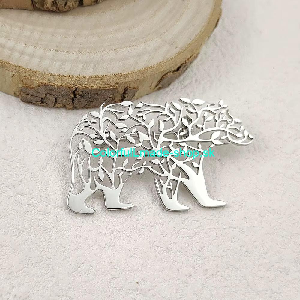 Ozdobná celokovová brošňa v tvare medveďa. Zo zadnej strany má zatvárací špendlík s poistkou.