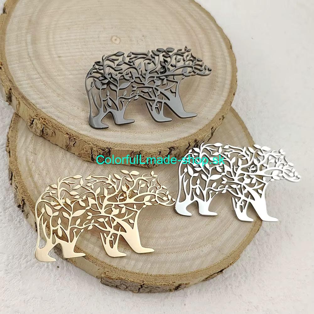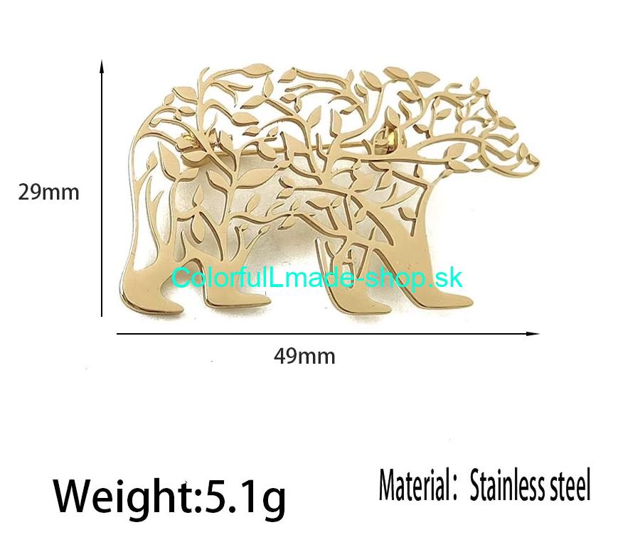 Ozdobná celokovová brošňa v tvare medveďa. Zo zadnej strany má zatvárací špendlík s poistkou.