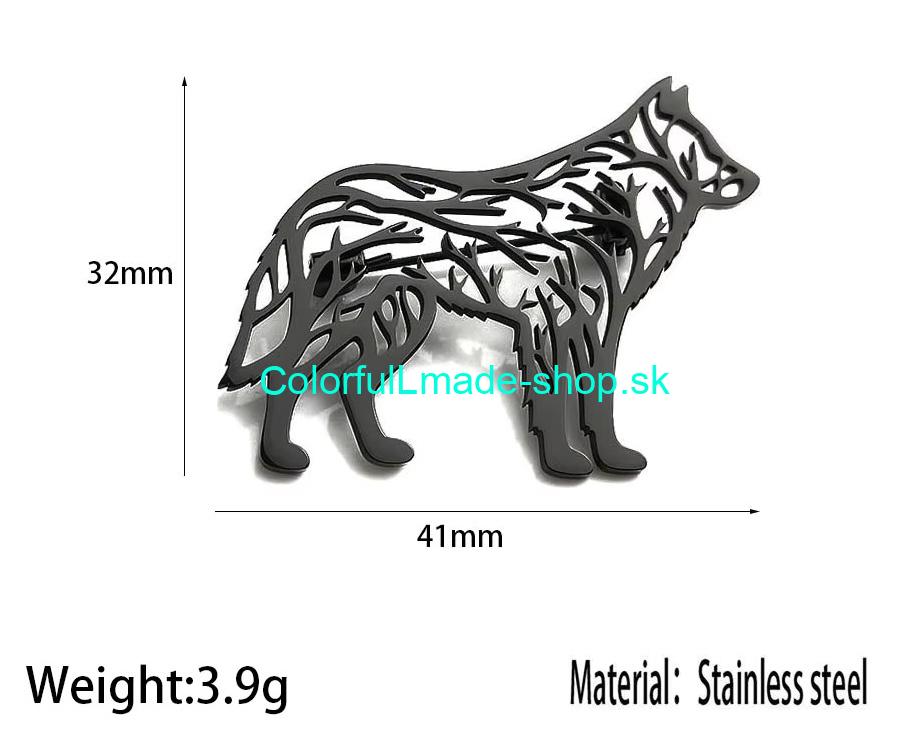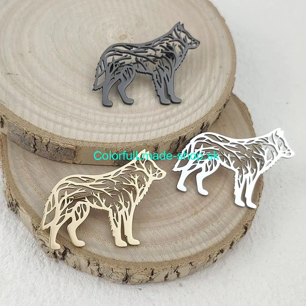 Ozdobná celokovová brošňa v tvare vlka. Zo zadnej strany má zatvárací špendlík s poistkou.