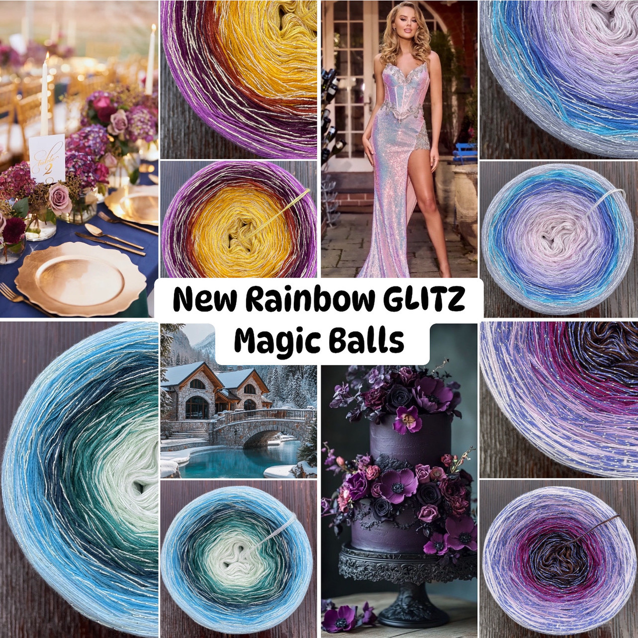 Collection of Magic Balls where a tread of one color with a glitter tread goeas along the whole yarn