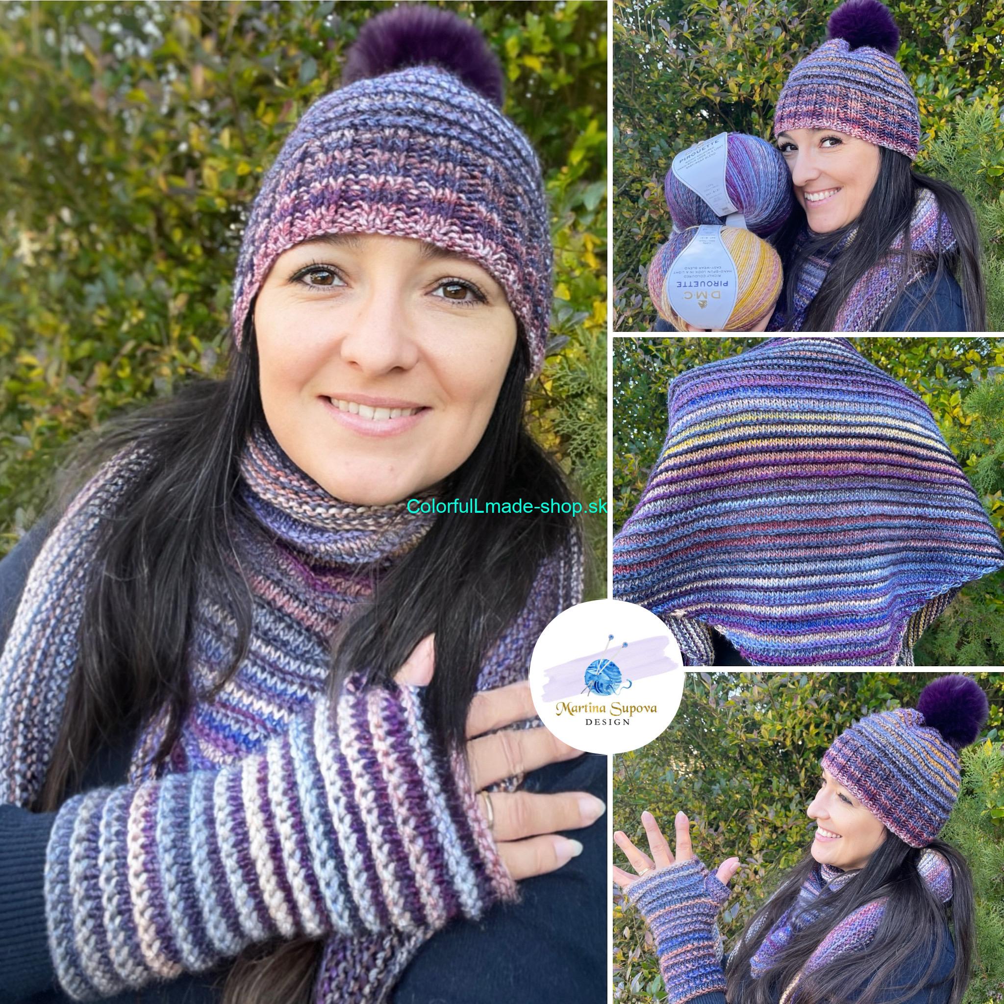 Návod na jednoduchú pletenú šatku s pretiahnutými cípmi od Martina Supova Design - vhodná do bundy alebo kabáta - k čiapke a bezprstovým rukaviciam s rovnakým vzorom.