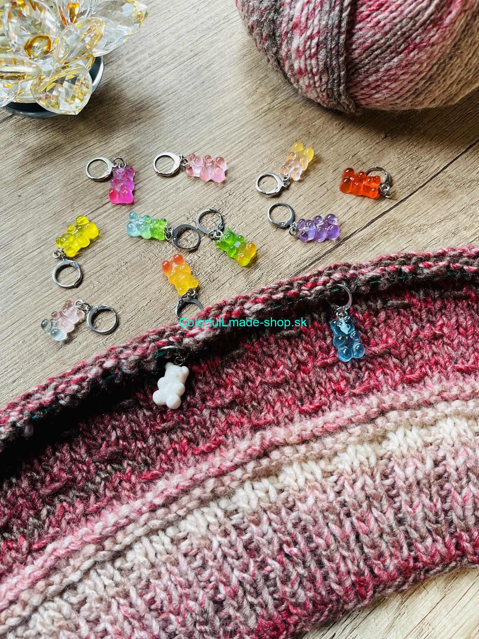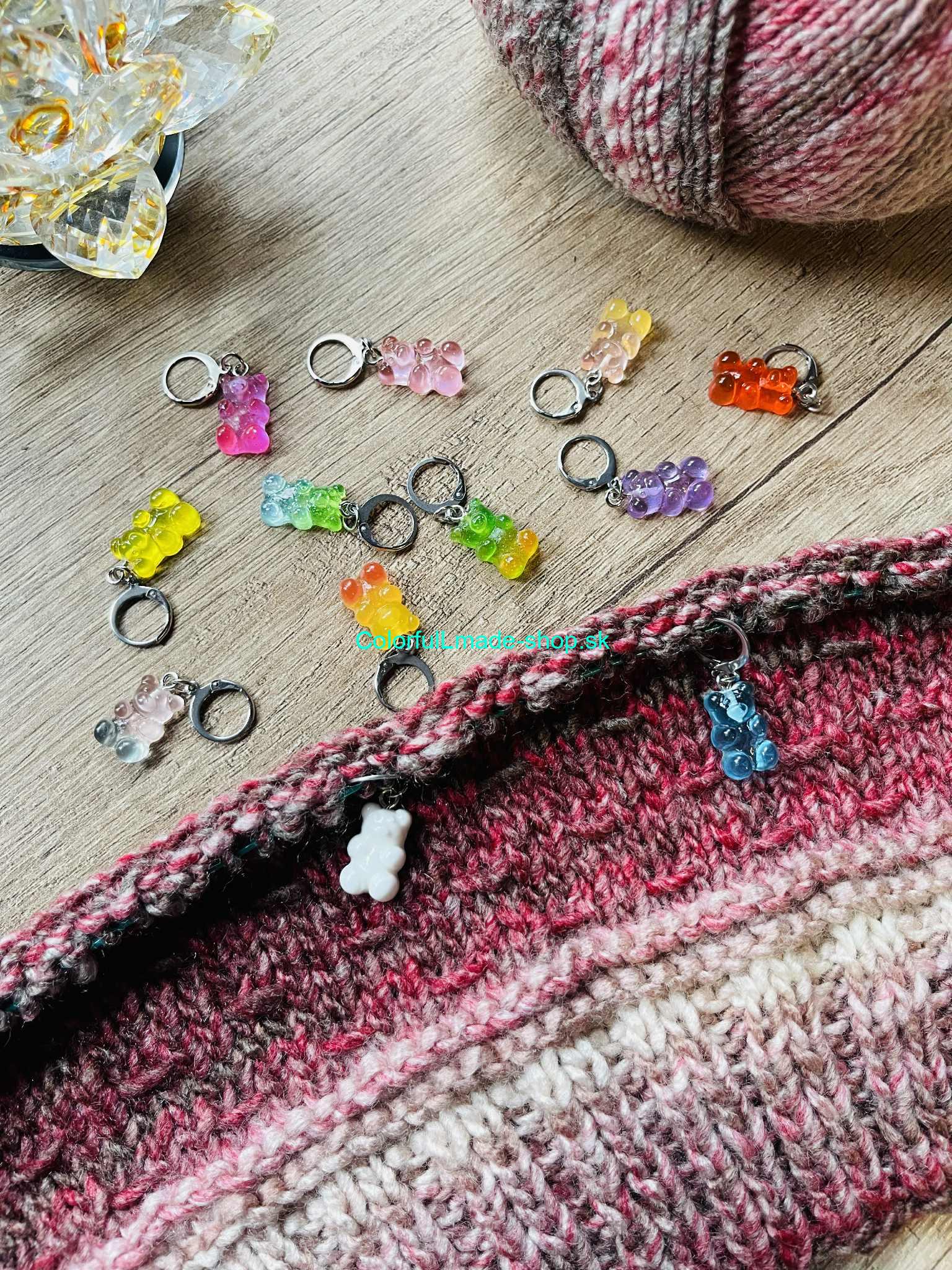 Kovové značkovače v tvare gumených medvedíkov - rôzne farby - celkovo 12 kusov sú vynikajúcim pomocníkom najmä pri pletení ale aj háčkovaní na označenie zmeny vzoru, alebo pridávania či uberania pleteniny.
